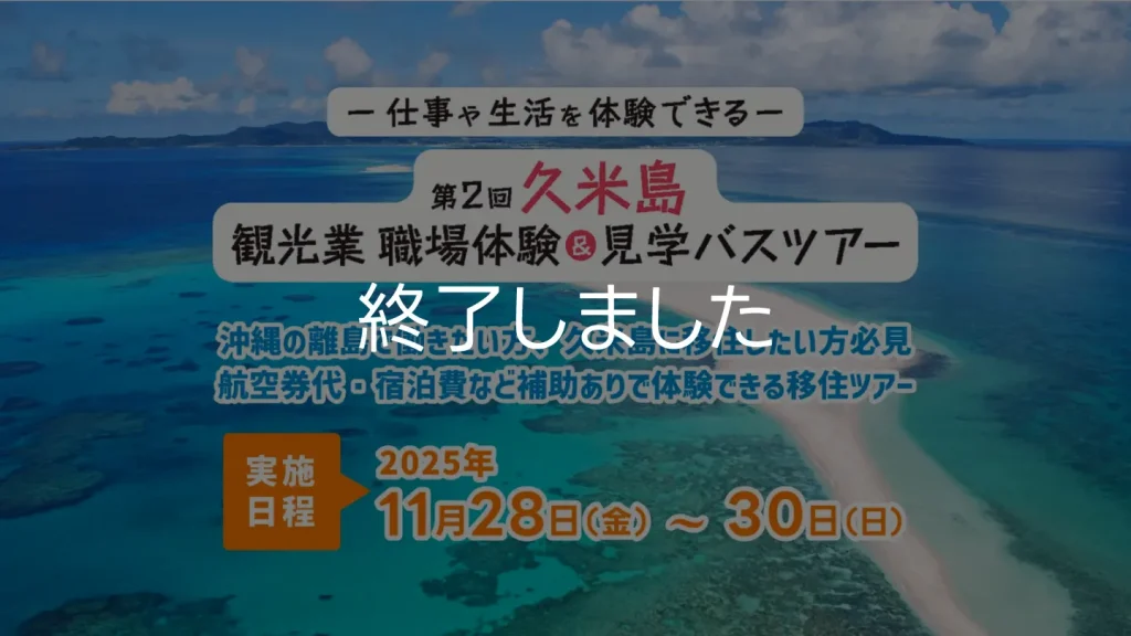 久米島で「観光業の仕事」と「島での暮らし」を体感できる特別プログラム。 企業見学や職場体験、生活施設の見学に加え、先輩移住者や島の人との交流会も予定しています。